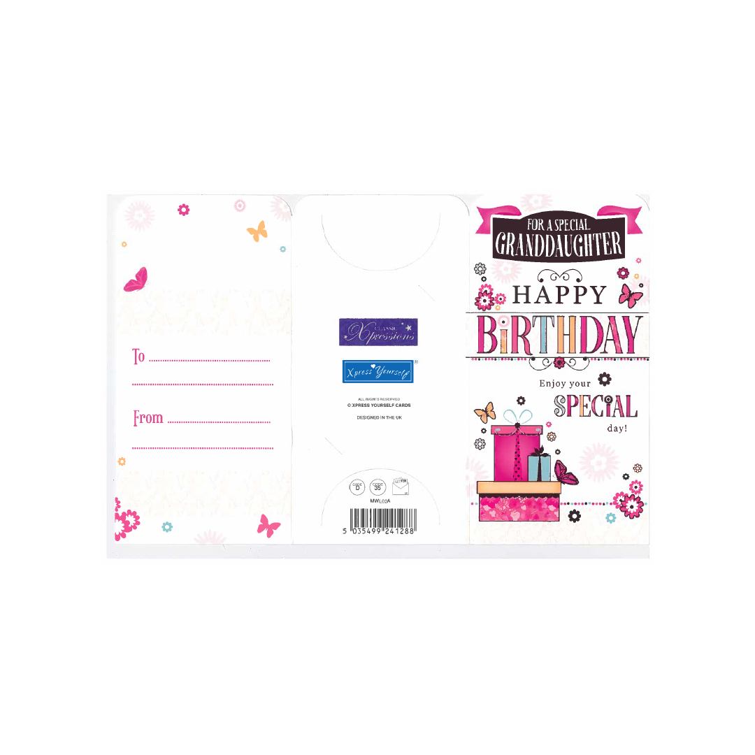 Celebrate your Special Granddaughter special day in style with our Money Wallet Gift Card! This beautifully designed gift card is the perfect birthday present for your beloved Granddaughter. Featuring a vibrant and colorful design, this gift card is sure to bring a smile to her face. The card comes with a matching envelope, adding an extra touch of elegance to your gift.The inside of the card is left blank, allowing you to personalize it with your own heartfelt message. Simply fill in the 'from' and 'to' information, and your gift is ready to go!