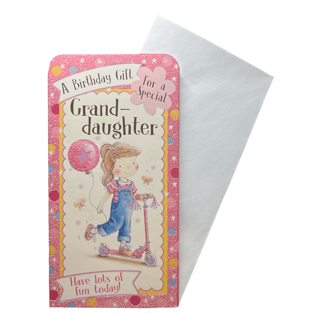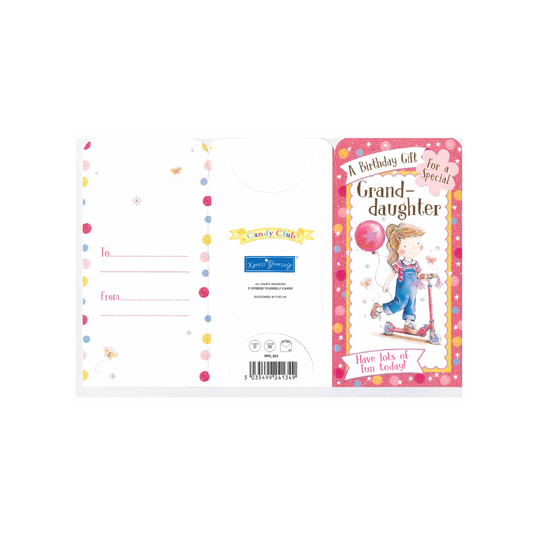 Celebrate your Special Granddaughter special day in style with our Money Wallet Gift Card! This beautifully designed gift card is the perfect birthday present for your beloved Special Granddaughter. Featuring a vibrant and colorful design, this gift card is sure to bring a smile to her face. The card comes with a matching envelope, adding an extra touch of elegance to your gift.The inside of the card is left blank, allowing you to personalize it with your own heartfelt message. Simply fill in the 'from' and 'to' information, and your gift is ready to go!