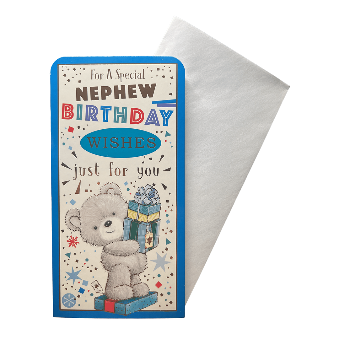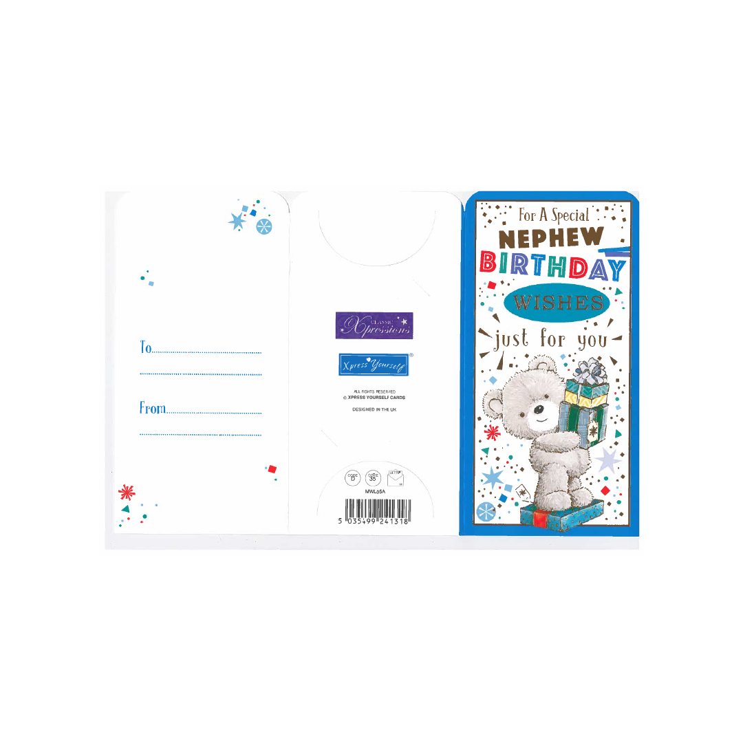 Celebrate your nephew's special day in style with our Happy Birthday Nephew Money Wallet Gift Card, a personalized and practical gift that he'll love receiving on his birthday. This beautifully designed gift card is the perfect birthday present for your beloved nephew's. Featuring a vibrant and colorful design, this gift card is sure to bring a smile to her face. The card comes with a matching envelope, adding an extra touch of elegance to your gift.The inside of the card is left blank, allowing you to personalize it with your own heartfelt message. Simply fill in the 'from' and 'to' information, and your gift is ready to go!