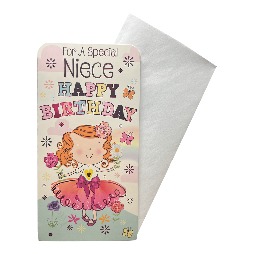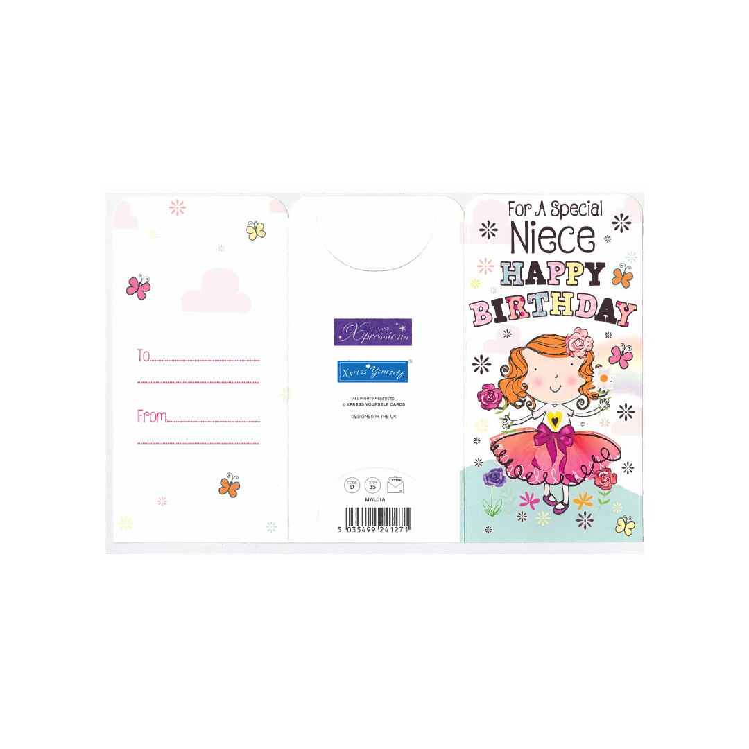 Celebrate your niece's special day in style with our Money Wallet Gift Card! This beautifully designed gift card is the perfect birthday present for your beloved niece.Featuring a vibrant and colorful design, this gift card is sure to bring a smile to her face. The card comes with a matching envelope, adding an extra touch of elegance to your gift.The inside of the card is left blank, allowing you to personalize it with your own heartfelt message. Simply fill in the 'from' and 'to' information, and your gift is ready to go!