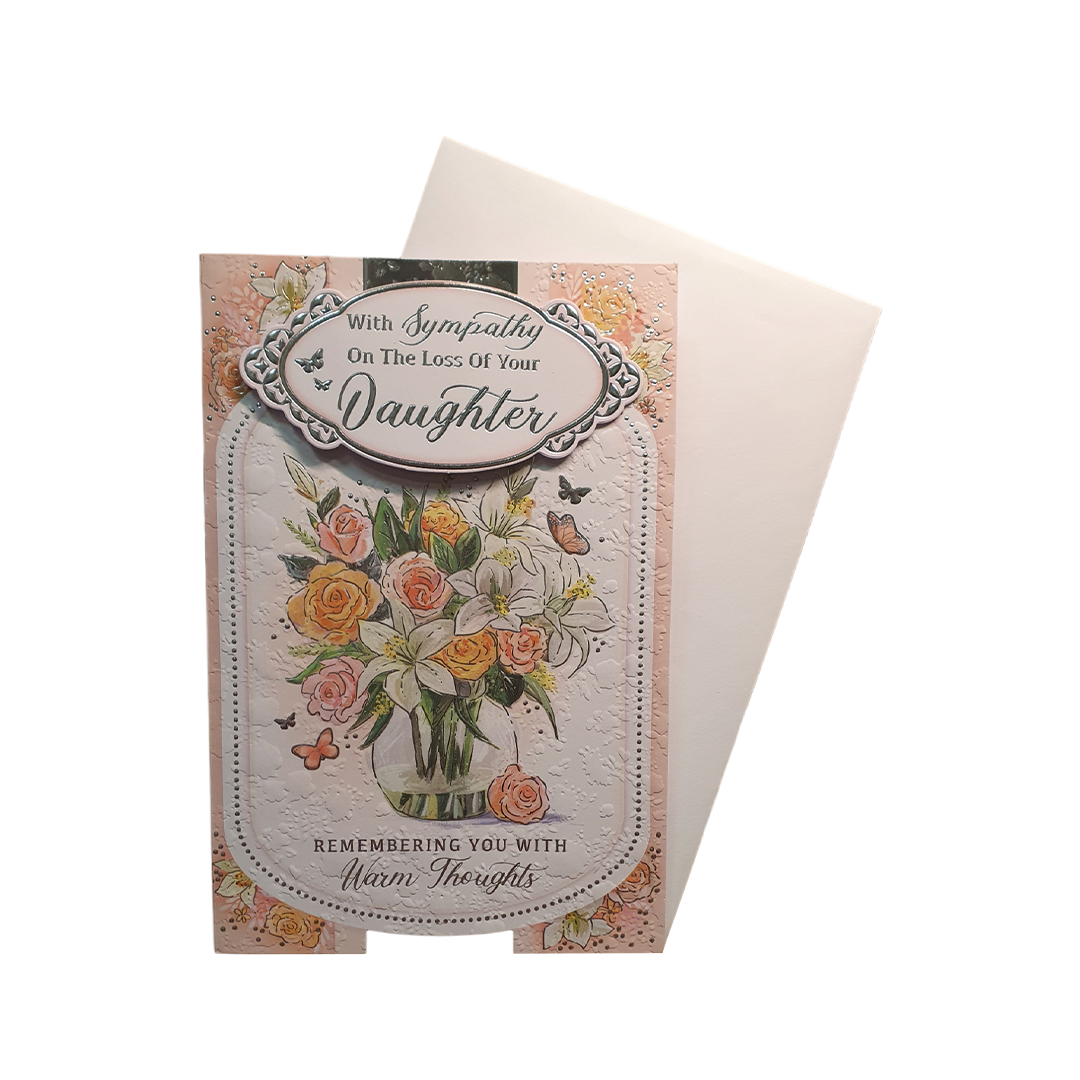 Celebrate special With Sympathy On The Loss Of Your Daughter Greeting Card This delightful card is the perfect way to convey your heartfelt Sympathy wishes and make the recipient's day even more joyful. With its vibrant design and thoughtful message, this card adds an extra layer of happiness and thoughtfulness to your Sympathy greetings.