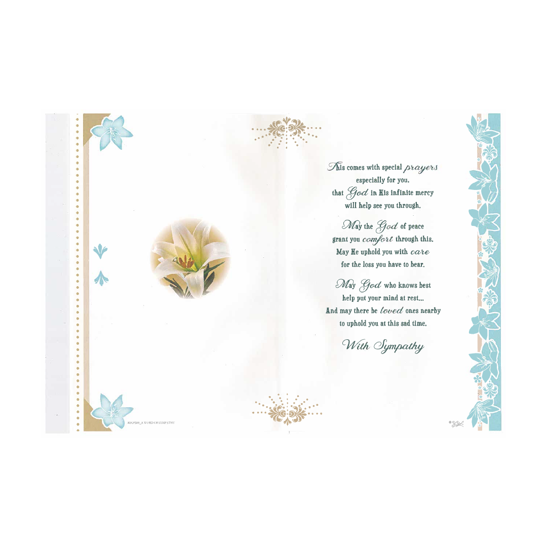 Sympathy card with image of scenery, flowers, and text that reads as follows: "A word of sympathy. When life seems unfair and you lose someone who feels dear.. When questions fill the heart and the answers cannot be found..may it help to know that your loved one is in God's hands and that others are thinking of you at this difficult time.."